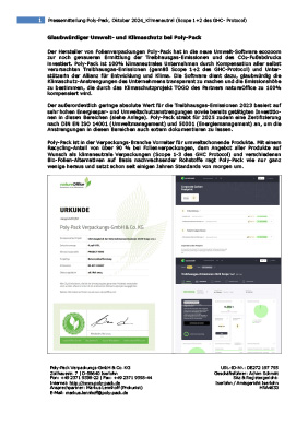 Poly-Pack ist 100% klimaneutrales Unternehmen durch Kompensation aller selbst verursachten Treibhausgas-Emissionen (gemäß Scope 1+2 des GHC-Protocol) und Unterstützerin der Allianz für Entwicklung und Klima. Die Software dient dazu, glaubwürdig die Klimaschutz-Anstrengungen des Unternehmens transparent zu machen und die Emissionshöhe zu bestimmen, die durch das Klimaschutzprojekt TOGO des Partners natureOffice zu 100% kompensiert wird.